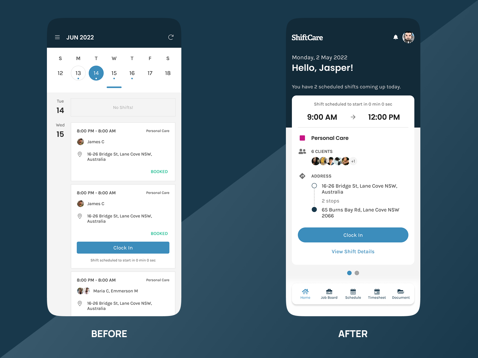 ShiftCare is a mobile workforce management app for professional caregivers. Its original experience forced users into long, slow-loading lists and buried critical shift details behind multiple taps. Caregivers needed a faster, more reliable way to see and start their next shift—so they can focus on delivering exceptional care, not wrestling with the app.